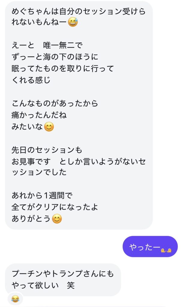 -case78- 海の下のほうに眠っていたもの 公開済み: 2025年12月24日更新: 2025年12月24日作成者: satomiカテゴリー: お客様から 60代女性 めぐちゃんは自分のセッション受けられないもんねー😅えーと唯一無二でずっーと海の下のほうに眠ってたものを取りに行ってくれる感じ こんなものがあったから痛かったんだねみたいな☺️ 先日のセッションもお見事ですとしか言いようがないセッションでした あれから1週間で全てがクリアになったよありがとう☺️ プーチンやトランプさんにもやって欲しい笑 関連記事 -case41- 自分の幸せの為にかわろうと前向きに 吉田先生昨日はありがとうございました😭 言葉で表すのは難しいのですが、RAS®️に出会うまえと後では全く違いました。 帰りの車の中で 涙が出てきましたが、いつもの涙ではなかったんです。 泣い […] 公開済み: 2022年2月19日更新: 2022年5月8日作成者: satomiカテゴリー: お客様から -case23- 交通事故の問題が 横を走る車のヨタヨタ運転に危険を感じてすぐ止まれるくらいのスピードに落としたところ、その車がどんどん寄ってきて接触。ガリガリとサイドが削れてしまったとのことでした。 理不尽に思える出来事も、引き寄せる事象(外側)には必ず […] 公開済み: 2021年3月14日更新: 2021年3月14日作成者: satomiカテゴリー: お客様から -case08- 答えは自分の身体が知っている 昔からエネルギーワークを受けるのが大好きで、今の仕事をするようになってからも知人から様々なワークを受けていました。 ◎◎からの解放 と謳ったワークもいくつか受けたことがありますが、正直言ってどれもピンと来ませんでした。と […] 公開済み: 2021年2月16日更新: 2021年2月19日作成者: satomiカテゴリー: お客様から この投稿へのトラックバック トラックバックはありません。 トラックバック URL