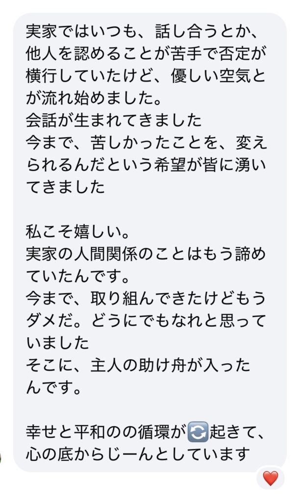 -case84- 幸せと平和の循環が広がって 公開済み: 2026年3月8日更新: 2026年3月9日作成者: satomiカテゴリー: お客様から 【RAS®に基づく感情消化セッション体験談】 50代女性 お一人の変化が、ご家族を静かに動かしていく。 ご本人から始まり、ご主人へ、そしてご主人の勧めで彼女のお父様、お母様、そしてお姉様へ。 優しい波紋のように幸せと平和の循環が広がっていく。 そのエネルギーの広がりを見せていただいているようでわくわくしています。 (掲載許可をいただきシェアしております) 関連記事 -case54- ご自身の「ある」に気付いてから 【RAS®︎体験談】 初めてお会いした頃は「ない」世界で悲しんでおられたのに、ご自身の「ある」に気付かれ、そのたびに様々な変化をお知らせくださり、そのスピード感もどんどんアップしていくのを感じます。 公開済み: 2024年1月29日更新: 2024年1月30日作成者: satomiカテゴリー: お客様から -case39- 便秘や頭痛、腰痛等まで解消 解放したお悩みのテーマは人間関係やお仕事のことだったりするのに、セッションの後、気になっていたけれど今回テーマにはあげていない便秘や頭痛、腰痛等まで解消してしまい驚きましたというご報告はとても多いです脳が […] 公開済み: 2022年1月29日更新: 2022年1月29日作成者: satomiカテゴリー: お客様から -case42- やっと母に対する正直な気持ちに向き会えました こんばんは 長くなりますがごめんなさい 今、母が亡くなってから初めて母が恋しくて悲しくて生きているうちに母の心に寄り添ってあげたかったと急にその思いが湧き出して涙がとまりません オンオン泣いています 木曜日にめぐみさんの […] 公開済み: 2022年2月24日更新: 2022年2月28日作成者: satomiカテゴリー: お客様から